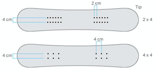 Ci sono quattro diversi tipi di boccolatura nelle tavole da snowboard moderne. I modelli sono: 4x4, 2x4, Burton 3D e Burton Channel. 3D e Channel sono specifici del marchio Burton. Il 2x4 è una variante del 4x4 che dà al rider più opzioni di montaggio.