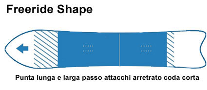 Shape Directional da Freeride è uno shape studiato appositamente per il fuoripista, nose molto lungo e ampio per galleggiare meglio nel powder ( neve fresca ) e passo e lamia arretrata in modo da aiutarti a tenere il peso indietro, la coda resta piccola e molte volte finisce a coda di rondine per facilitare l'uscita della neve fresca.