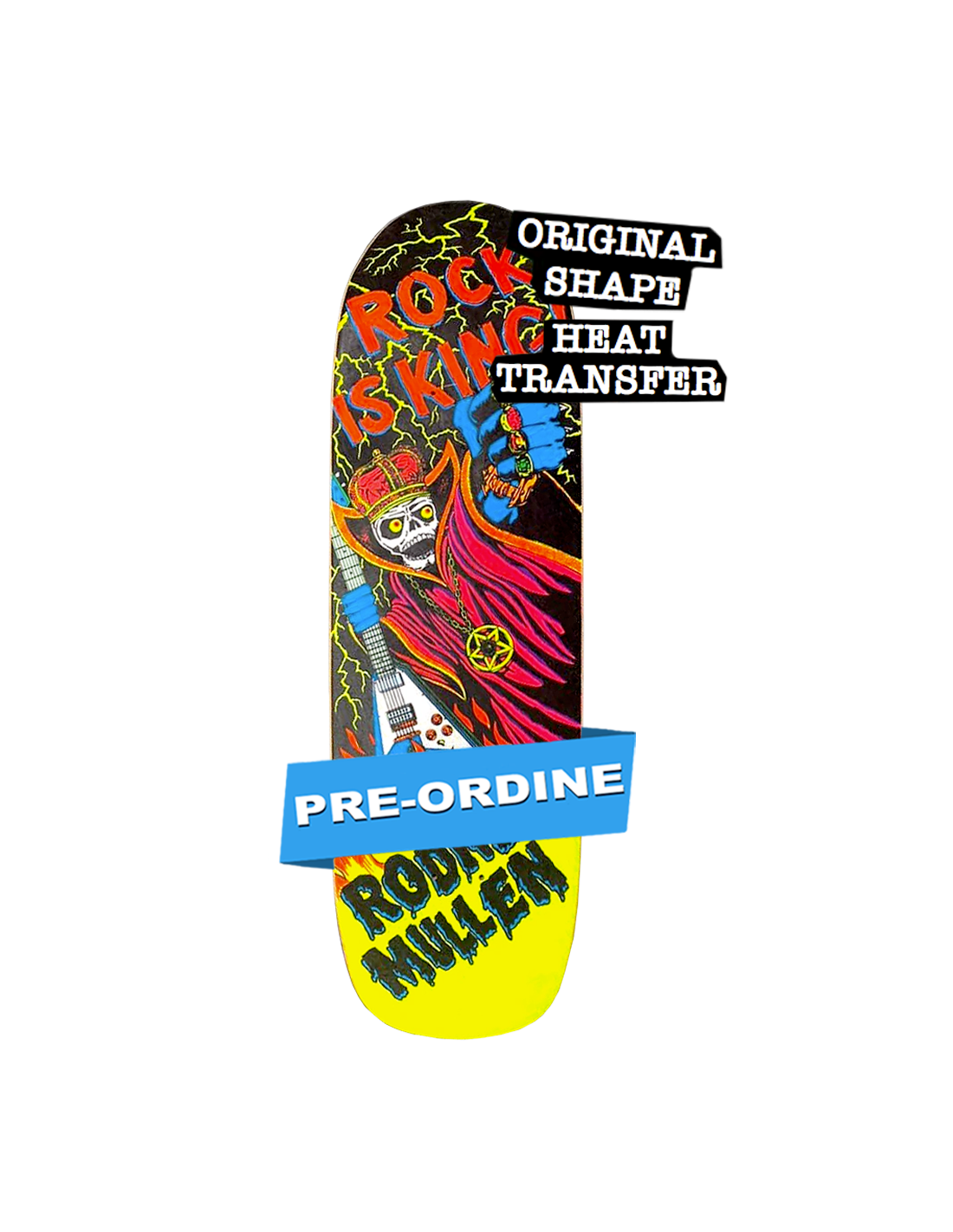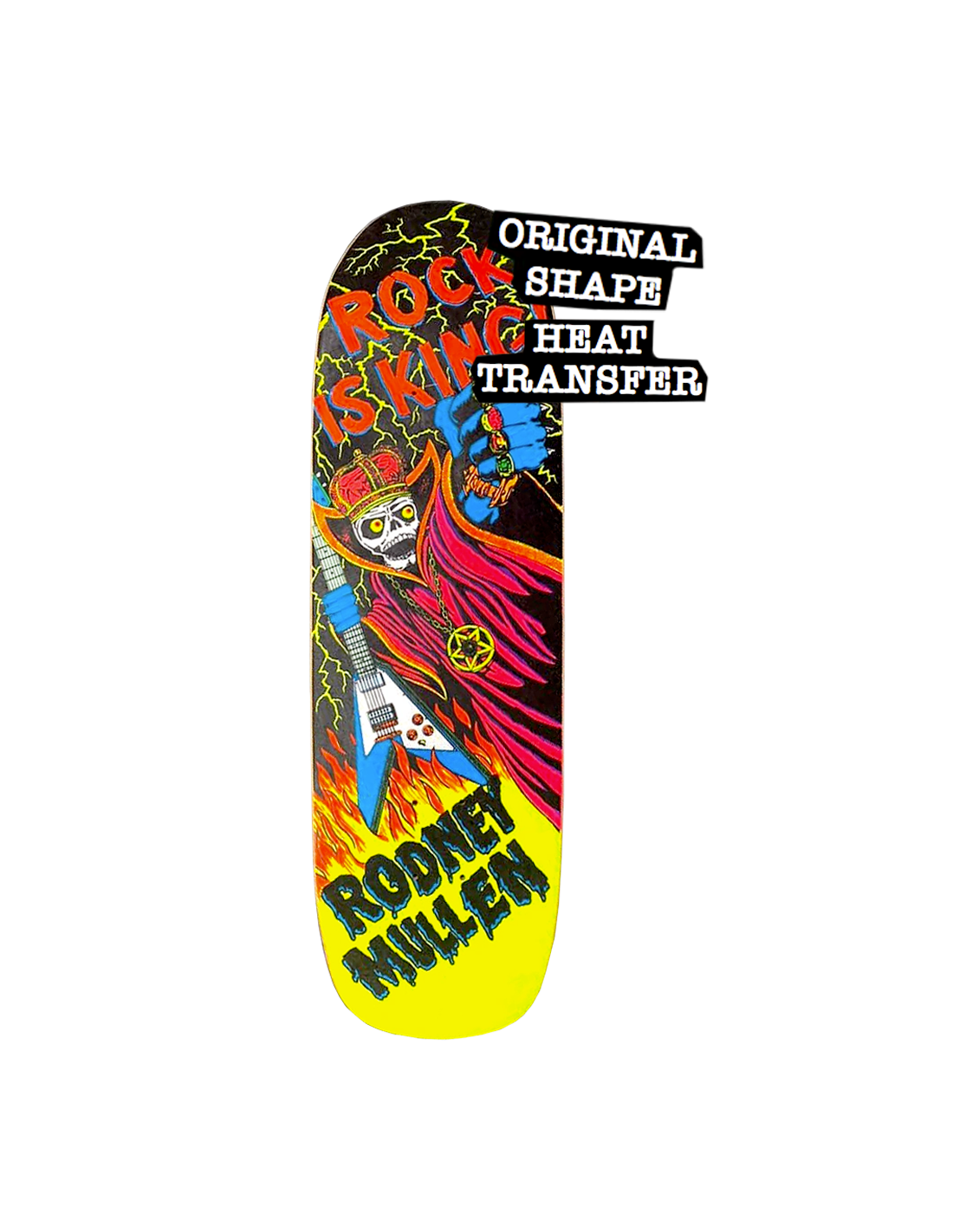 Rodney always hated this graphic. I am quite sure he still does. If you get one of these boards I would not suggest asking him to sign it. But it is, for good or ill, part of our companies history. Why Rodney always ended up with the worst graphics is not a story often talked about. In a way Rodney took a bullet each time one was released. But letting a graphic define Rodney is like Lincoln trying to ho- nor fallen soldiers with mere words at Gettysburg. There just aren’t enough of them so a few will have to make do. Rodney’s contribution to skateboar- ding will live on long after this horrible graphic is forgotten. And I simply don’t have the power to add or detract from someone who constantly gives his last full measure of devotion to advance skatebo- arding beyond its unfinished boundaries each time he puts a board under his feet. So all that is left for me, and all of you, to do is to either bow our heads down once in a while whenever we find ourselves rolling around or turn up the volume all the way and scream “Rock is King”!