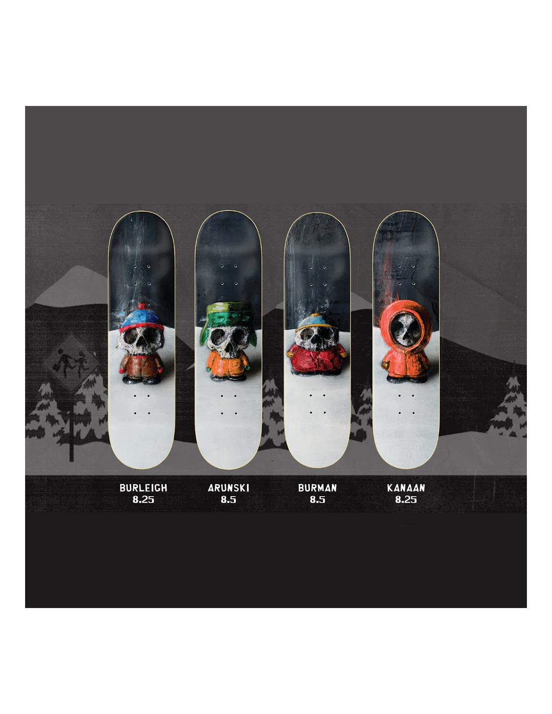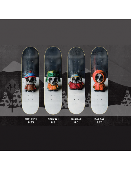 Questa collaborazione esclusiva porta i personaggi iconici di South Park nel mondo oscuro e crudo di ZERO Skateboards, grazie all’artista Adrien Conrad, con grafiche audaci ispirate all’horror che rendono ogni tavola un pezzo unico.